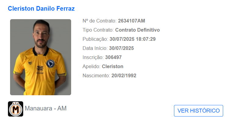O Manauara oficializou nesta quarta-feira (30) a contratação do goleiro Clériston, de 33 anos, para a disputa da segunda fase da Série D do Campeonato Brasileiro. Ex-Centro Oeste-GO, o experiente jogador já está regularizado no BID da CBF e pode estrear na próxima partida da equipe.