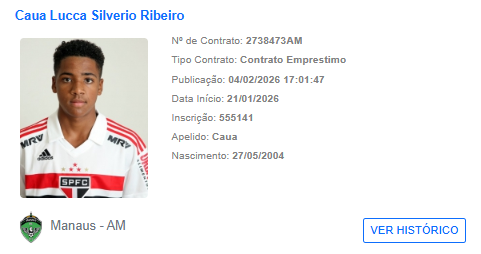 O Manaus FC segue ativo no mercado e acertou mais um reforço para a temporada 2026, nesta quarta-feira (4). Trata-se do meia Cauã Lucca, de 21 anos, que chega por empréstimo do São Paulo em busca de rodagem e mais minutos em campo. O jogador já teve o nome publicado no Boletim Informativo Diário (BID) da CBF e pode ficar à disposição do técnico João Victor para a estreia no segundo turno do Campeonato Amazonense, diante do Princesa do Solimões, com data a ser definida.