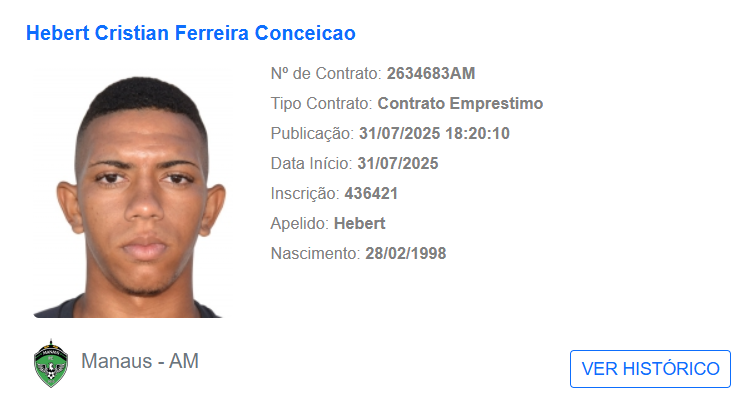 O Manaus confirmou nesta quinta-feira (31) a contratação do volante Hebert Cristian, de 27 anos, como reforço para a disputa da segunda fase da Série D do Campeonato Brasileiro. O jogador chega por empréstimo do Sousa-PB e é o terceiro nome anunciado para o mata-mata, após os retornos do zagueiro Jefferson e do atacante Jonas.